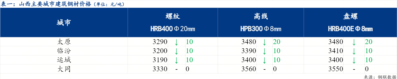 今日山西省建筑钢材区域价格下跌。太原市场螺纹钢价格3290元/吨,较昨日价格下调10;临汾市场螺纹钢价格3200元/吨,较昨日价格下调10 ;运城市场螺纹钢价格3190元/吨,较昨日价格下调10 ;大同市场螺纹钢价格3330元/吨,较昨日价格持稳。
